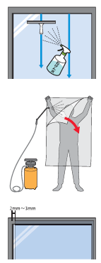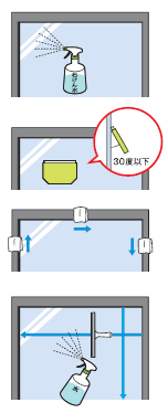 ●ガラス全面に水またはせっけん水を噴霧し、スクレーパーなどでガラス表面のゴミを除去します。