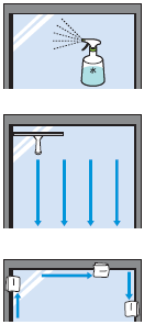 ●ガラスにせっけん水を噴霧し、ロングブレードワイパーで上から下へ洗い流します。