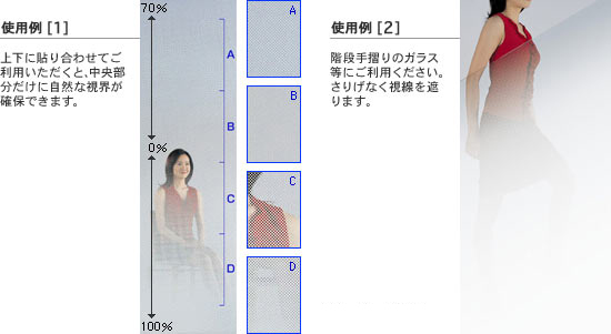 足元だけをさりげなく隠したい、というときにお勧めのフィルムです。デパートやガラス張りのオフィス、学校内の階段手すり部分などで、よく使用されています。