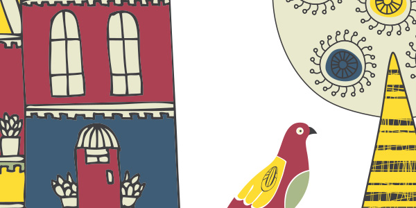 カラフルなおうちと鳥が楽しいデザイン。