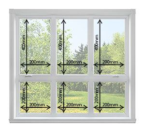 A. 窓サッシを除いたガラス面の寸法をお知らせください。 熱割れが生じるか確認させて頂く際に、サッシを含んで実際より大きくガラスのサイズをお知らせ頂くと正確な結果が出ませんので、大変お手数ではありますが、窓サッシで区切られている際には例2のように分割してお考えください。